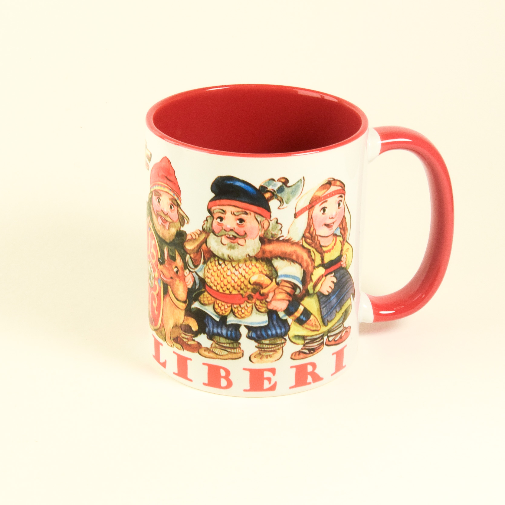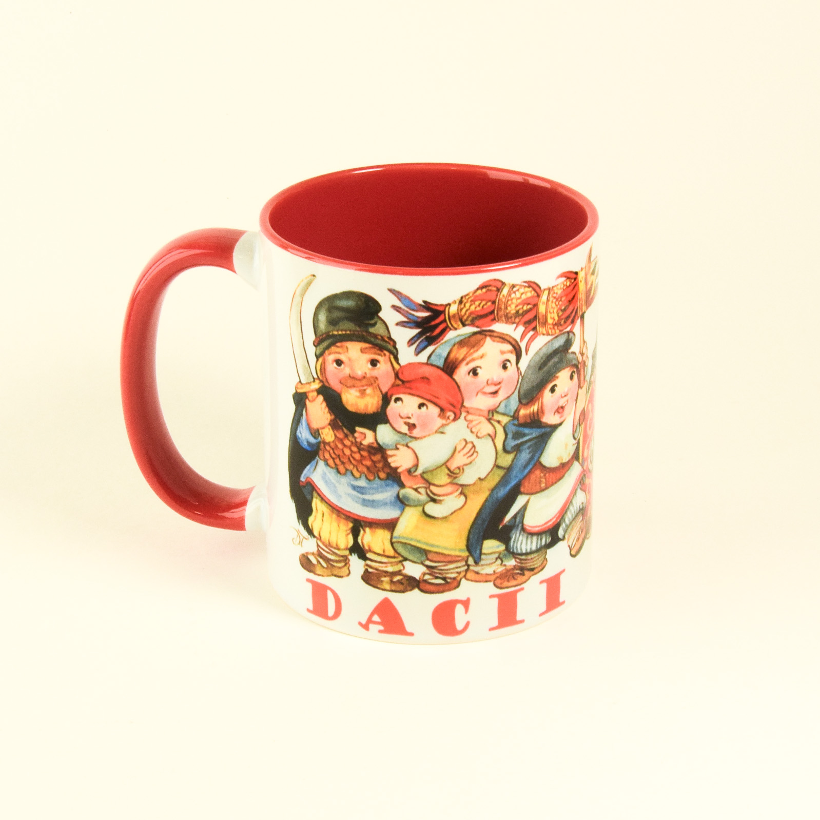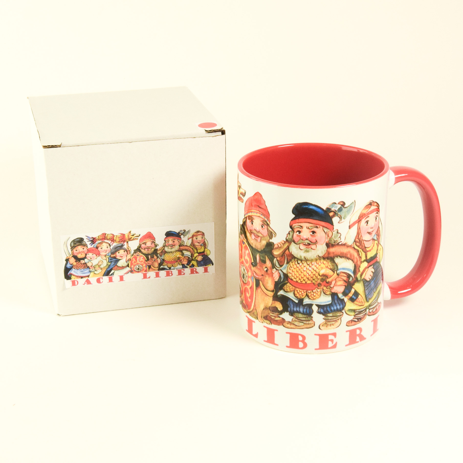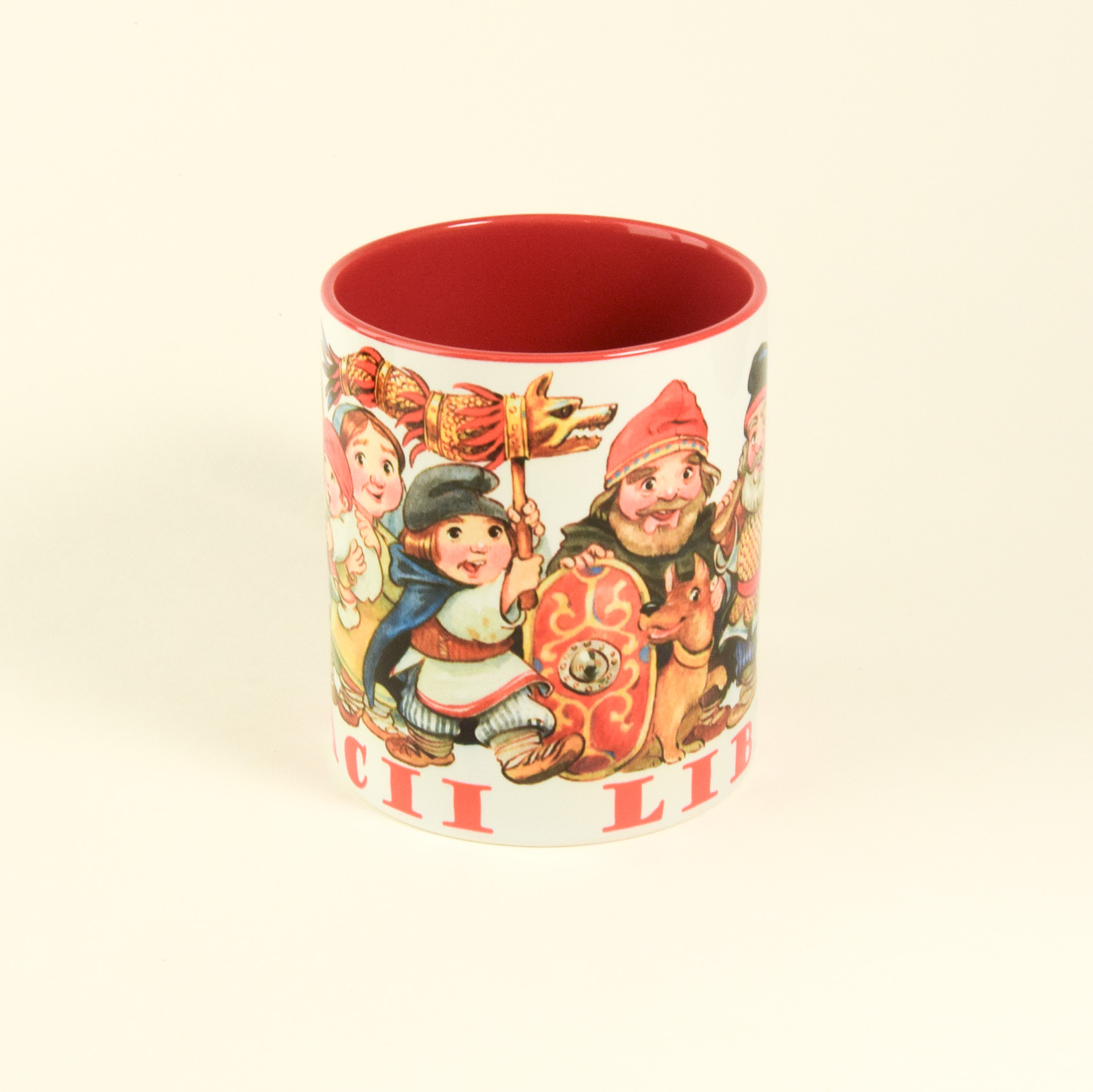 Cană ceramică, culoare albă la exterior cu print color, mâner și interior roșu.
